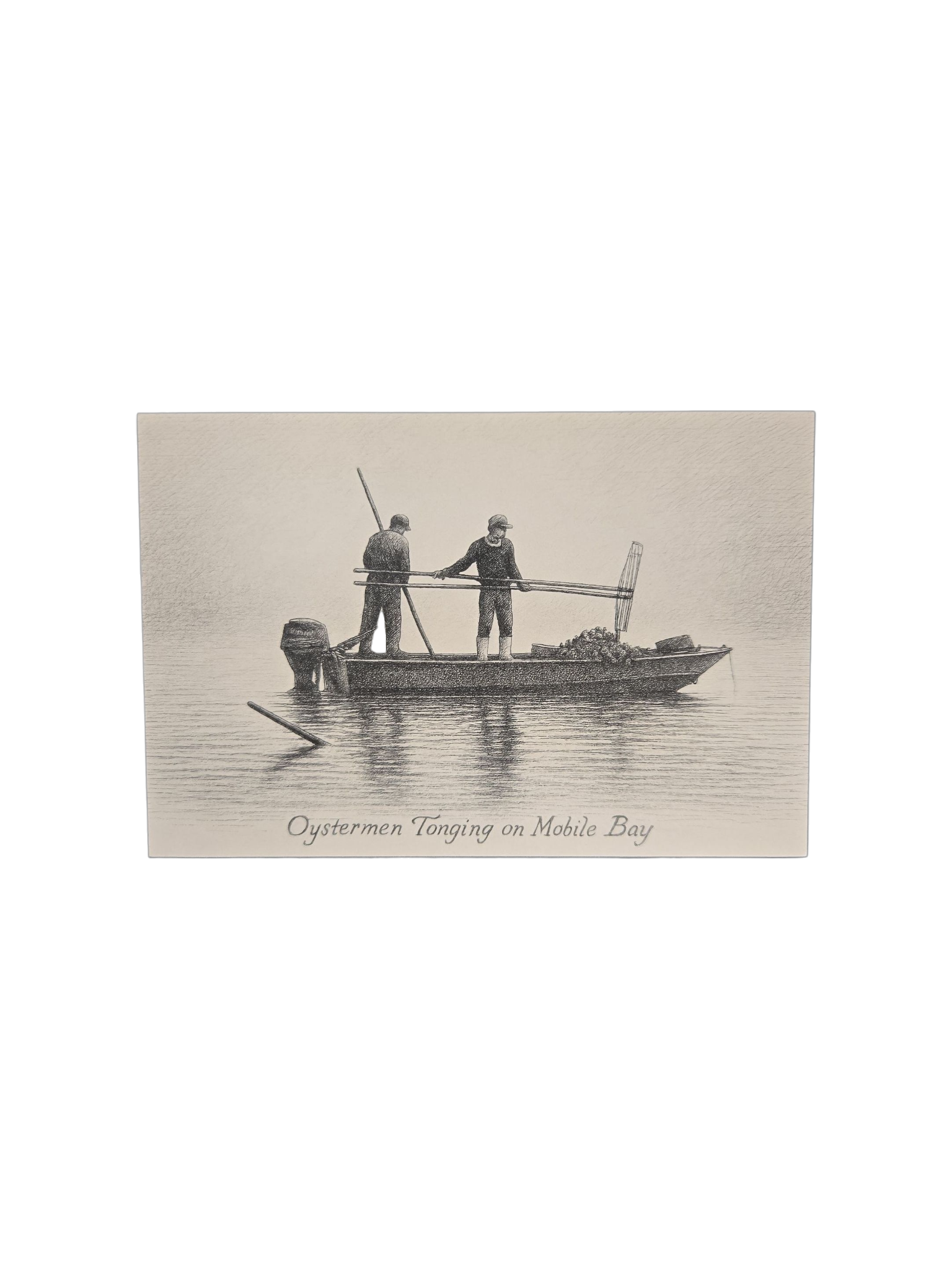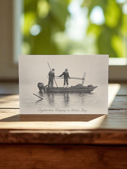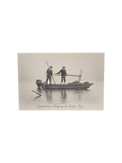 Rooted in heritage and rendered in timeless sepia tones, this Oystermen Tonging on Mobile Bay postcard captures a quiet moment of hard work and tradition. Two oystermen stand aboard a small wooden boat, working long-handled tongs through the still waters of Mobile Bay—a practice that has fed families and shaped the Gulf Coast for generations.